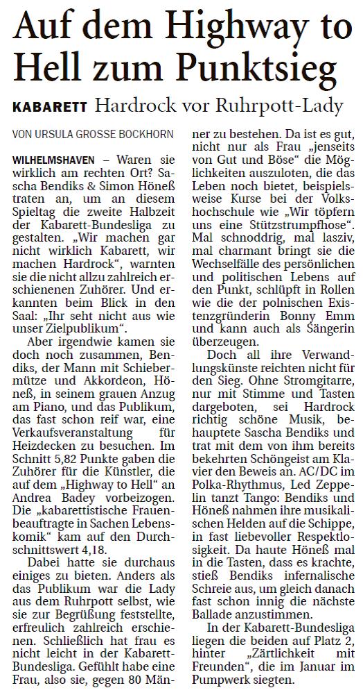 Auf dem Highway to Hell zum Punktesieg 16:24RedaktionAllgemein, Presse, Freunde0 Wilhelmshaven – Waren sie wirklich am rechten Ort? Sascha Bendiks & Simon Höneß traten an, um an diesem Spieltag die zweite Halbzeit der Kabarett-Bundesliga zu gestalten.
