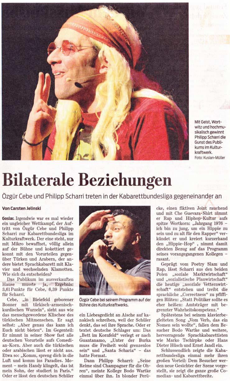 Bilaterale Beziehungen 09:41PresseAllgemein, Presse, Freunde0 Von Carsten Jelinski/Goslarsche Zeitung// Irgendwie war es mal wieder ein ungleicher Wettkampf, der Auftritt von Özgür Cebe und Phillip Scharri zur Kabarettbundesliga im Kulturkraftwerk …