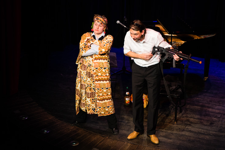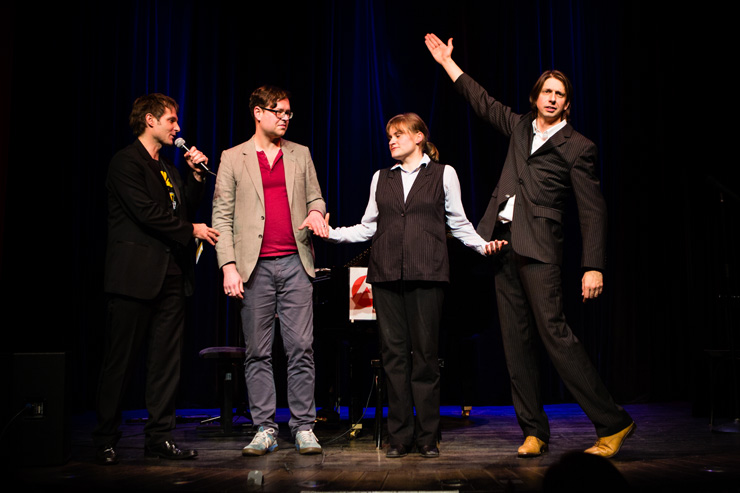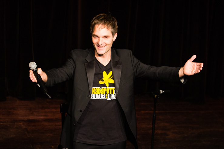Zur zweiten Halbzeit betritt dann das Ensemble Weltkritik die Bühne. Noch etwas unsicher, aber fest entschlossen eine tolle Show zu liefern. Herr Pöltnitz, der zuständige Sachbearbeiter bei der ARGE, war höchstpersönlich erschienen und wurde von Herrn Lühmlich sogleich persönlich mit einer Tasse frisch gepresstem Saft begrüßt. Die arbeitslosen Akademiker begeisterten gut und günstig wie Erdnuss-Flips mit Wortakrobatik, politischer incorrectness und wahnsinnig tollen Improvisationen durch Frau Sumpf-Pretsch.