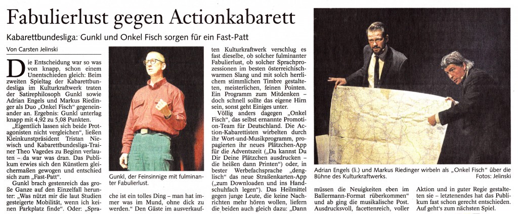 Die Entscheidung war so was von knapp, schon einem Unentschieden gleich: Beim zweiten Spieltag der Kabarettbundesliga im Kulturkraftwerk traten der Satirephilosoph Gunkl sowie Adrian Engels und Markus Riedlinger als Duo „Onkel Fisch“ gegeneinander an …