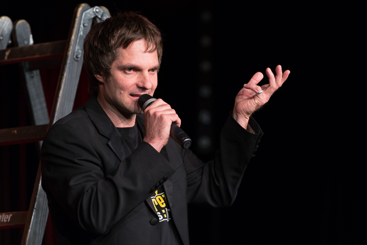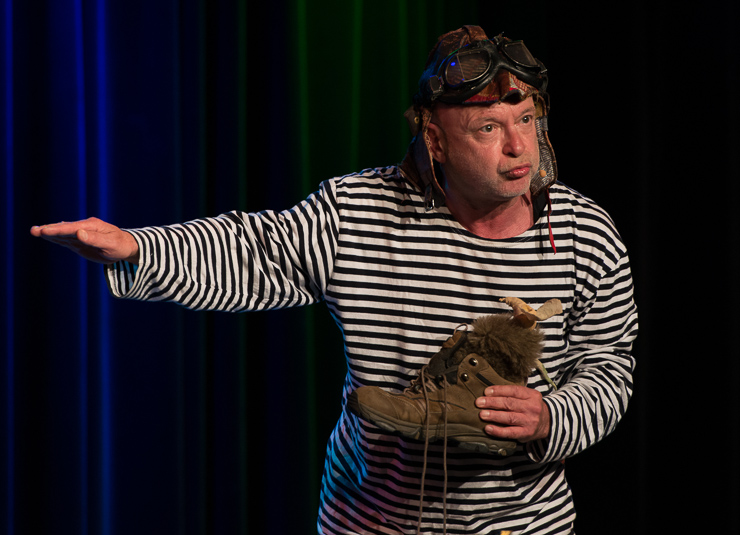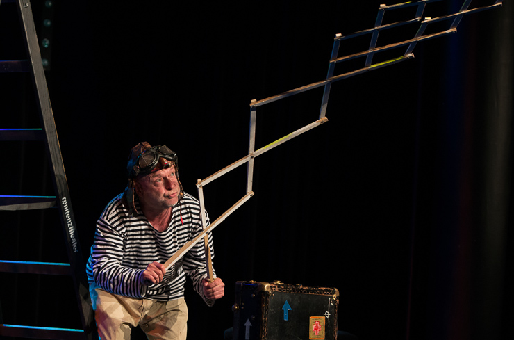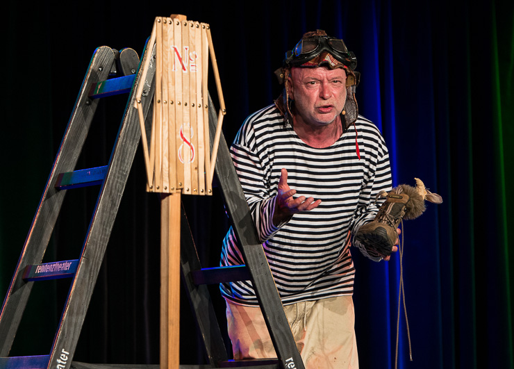 Doch Krüger kann noch mehr, er nimmt uns mit in die Lüfte, bis auf 8000 Meter hoch hinauf. Leider hat sein Flugzeug Probleme, schon bei 500 Meter löst sich die Kanzel, naja, kein Wunder, der Klebstoff aus alten DDR-Beständen. Krüger trägt einen Sprachfehler davon, man hört es deutlich. Bei 1000 Meter fängt alles an zu vibrieren, wir spüren das, es geht uns durch und durch. Doch bei 7000 Meter tritt absolute Stille ein, ein Barsch mit seiner Mutter schwimmt vorbei, unterhält sich ein bisschen mit Krüger, merkt dann aber, dass er da doch nicht hingehört. Nun reitet Krüger der Beelzebub, er geht auf 8000 Meter. Das hätte er nicht tun sollen, die Schnitten von Saskia, die er vorher gegessen hat, mögen das gar nicht und wir erleben das mit, wirklich ein Erlebnis!