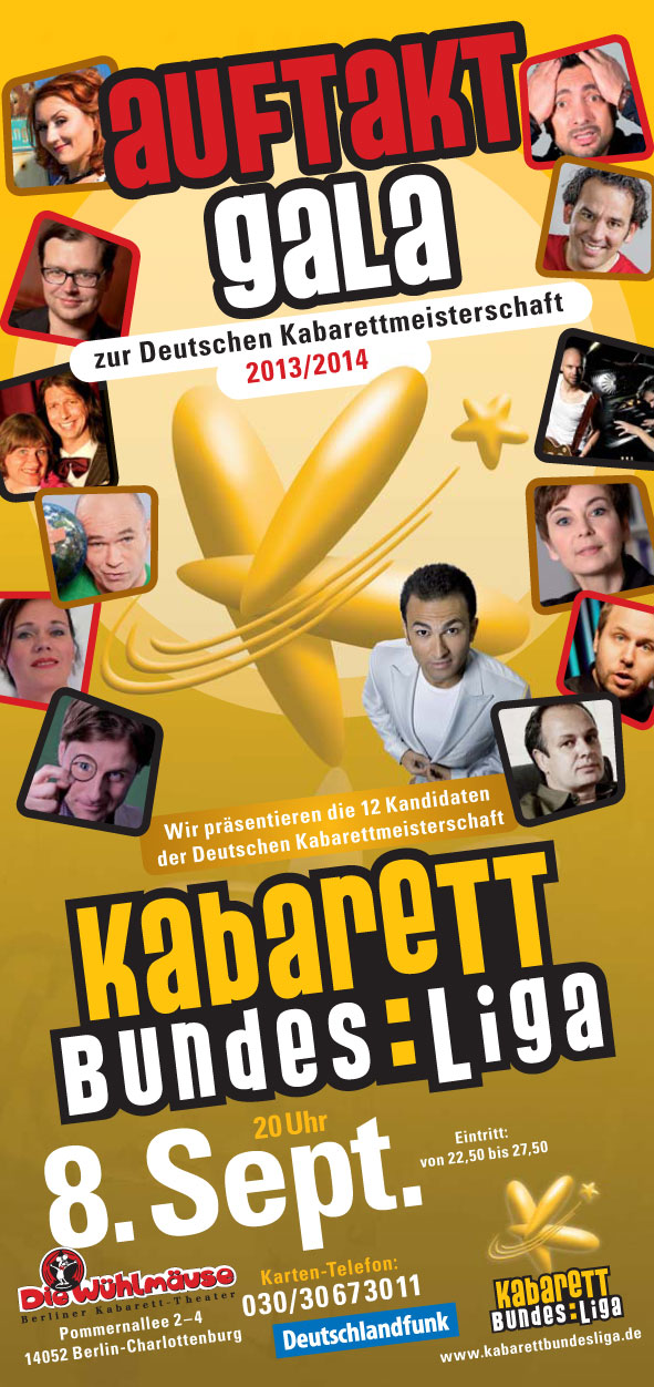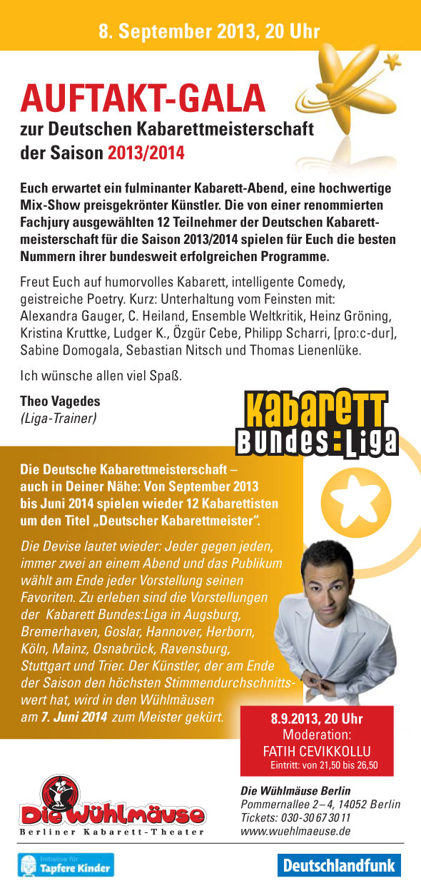 Es ist wieder soweit: Die Deutschen Kabarettmeisterschaft startet in die fünfte Saison und das mit einer fulminanten Eröffnungsgala am 08.09.2013 in den Wühlmäusen Berlin. Eine einmalige Gelegenheit die nominierten Künstler der Saison 2013/2014 in einer abwechslungsreichen Mixshow zu erleben. Die Vorstellung beginnt um 20:00 Uhr. Durch den Abend führen wird der aus Funk- und Fernsehen bekannte Kölner Kabarettist Fatih Cevikkollu. Von September 2013 bis Juni 2014 spielen die von einer Fachjury ausgewählten Künstler bundesweit in elf Städten um den Meistertitel. Wer nach den 132 Auftritten den größten Kabarett-Publikumspreis der Republik gewinnt, entscheidet das Publikum. Live zu erleben ist die Deutsche Kabarettmeisterschaft im Parktheater Augsburg, Capitol Bremerhaven, Kulturkraftwerk Goslar, Theater am Küchengarten Hannover, Kulturscheune Herborn, Senftöpfchen Köln, Unterhaus Mainz, Lagerhalle Osnabrück, Zehnscheuer Ravensburg, Renitenztheater Stuttgart und in der Tuchfabrik Trier. Alle Infos unter: www.kabarettbundesliga.de