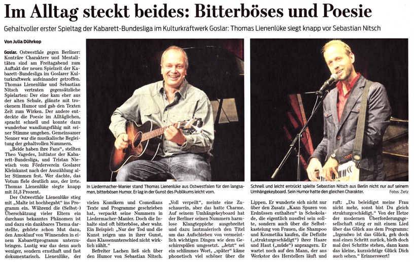 Von Julia Dürkop/Goslarsche Zeitung// Ostfwestfale gegen Berliner: Konträre Charaktere und Mentalitäten sind am Freitagabend zum Auftakt der neuen Spielzeit der Kabarett-Bundesliga im Goslarer Kulturkraftwerk aufeinander getroffen …