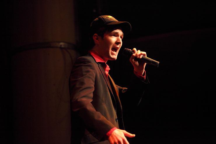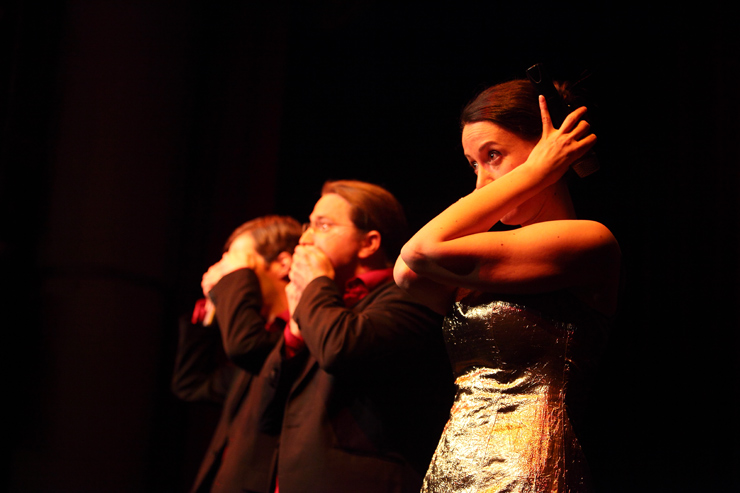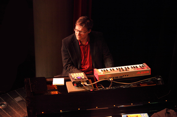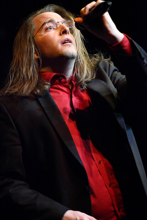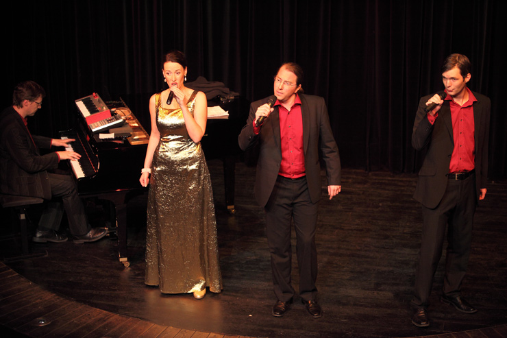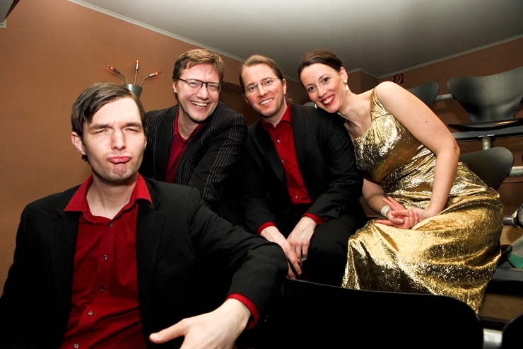 Dann erfüllen Vocal Recall die Bühne mit Glanz. Wenigstens Alice, die sich dem Anlass entsprechend in ein ferrero-rocherfarbiges Kleid gehüllt hat, während die Herren der Schöpfung lieber in Straßenklamotten auftreten. Dieter, der aus Ausniedersachsen, nicht aus Tralien kommt, kommt von der Landwirtschaft her und kann es nicht lassen, imaginäre Zäune durch den Publikumsraum zu ziehen und die Zuschauer in allerlei Vieh einzuteilen, das ihn bei seinen Gesangseinlagen dann tatkräftig mit muhen, oinken und gackern unterstützt. Mathis‘ Alter Ego Patrick schaut zwar ziemlich Hip aus, hat aber solche Schwierigkeiten mit seiner Aussprache, dass Kapellmeister Martin alle Zischlaute überpiepen muss. Bevor sich Vocal Recall nach wunderbaren 45 Minuten hinter die Kulissen zurückziehen, um dort die Reise ins Hotel vorzubereiten (- außer Martin, der schläft im Auto), wird das Publikum noch aufgefordert, die „Königin der Nacht“ zu singen. Denn auch hiervor machen Vocal Recall nicht Halt und interpretieren den Klassiker in allen möglichen alternativen Melodien, die die letzten Jahrhunderte eben so hergeben.