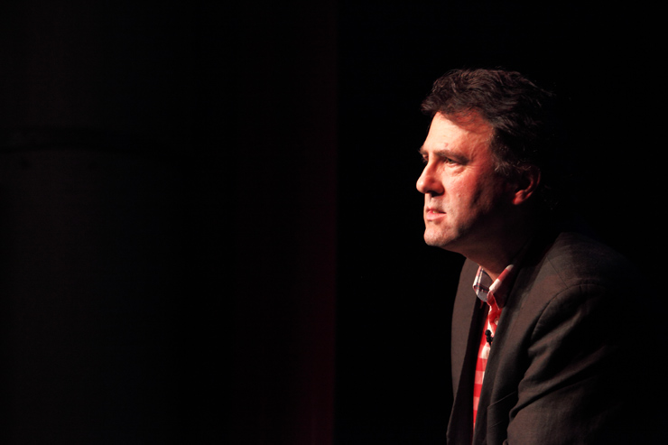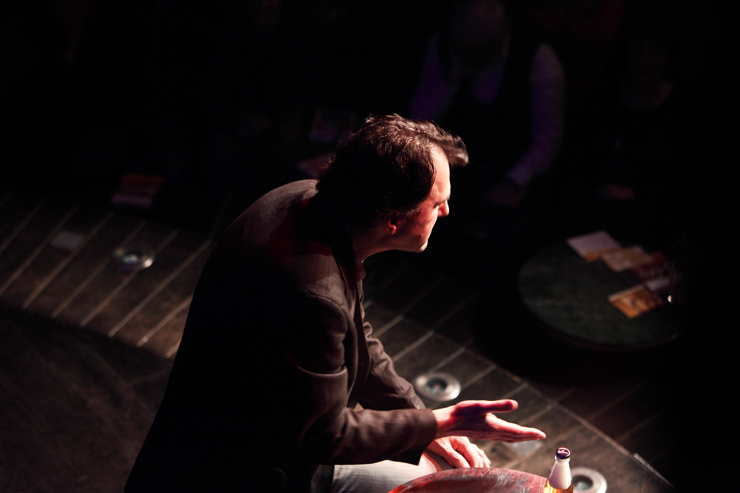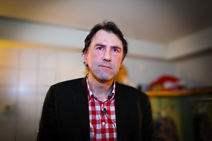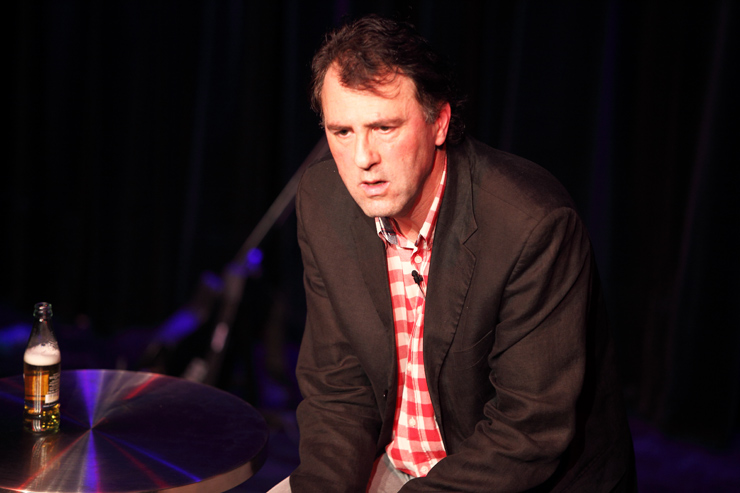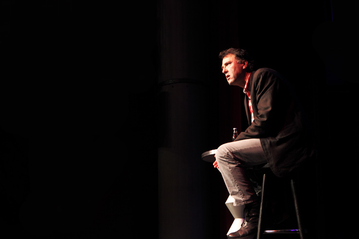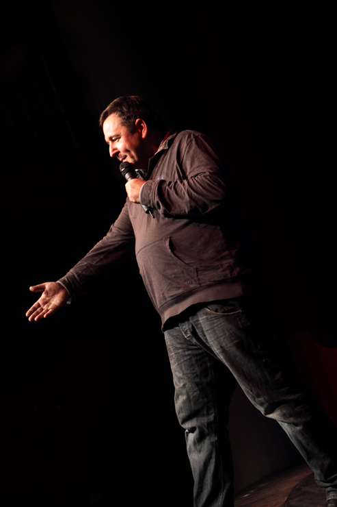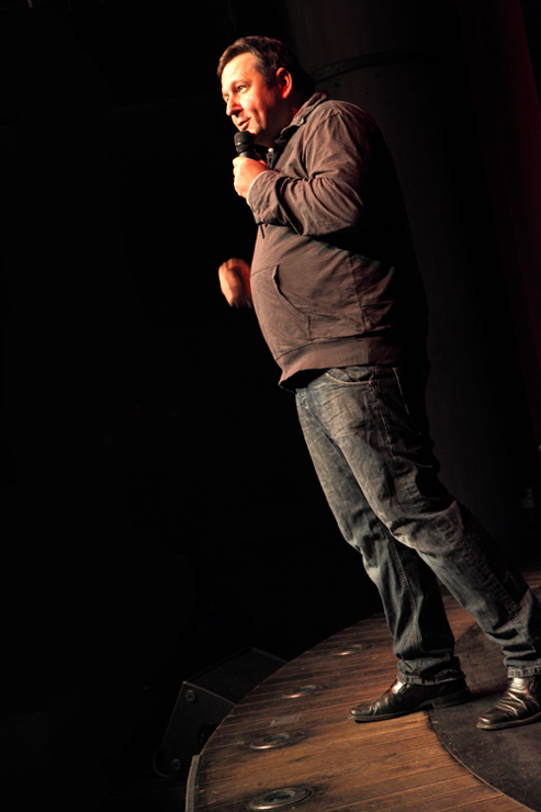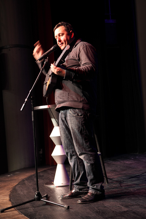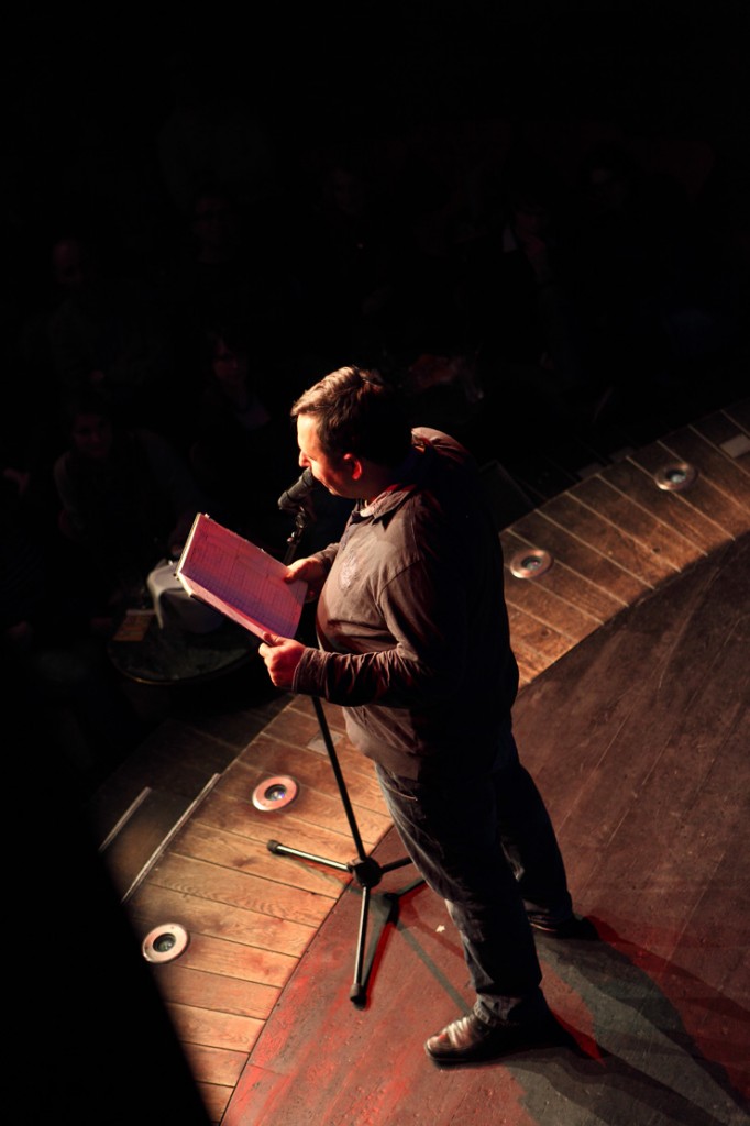 Waghubinger lässt es ruhiger angehen. Beinahe tut er einem leid wie er da sitzt, alleine auf der Bühne. Schon auf den ersten Blick scheint dieser Mann eine Menge Probleme zu haben. Er beginnt darüber zu sprechen. Über die Angst, die er hat, wenn sein Sohn trotz wiederholten Ermahnungen den Spielplatz nicht verlassen möchte, weil er weiß, was ihm zuhause blüht, wenn er zu spät kommt. Und über die Mühe, die er sich macht, wenn er mit seiner Hand auf echtes DinA4 Papier mit einem echten Stift eine echte Liebesbotschaft für die Frau schreibt. Dort gibt es einiges zu richten, denn er muss wohl ihren Geburtstag vergessen haben. Jedenfalls hat er seinen jetzt schon zweimal hintereinander gefeiert und sie ihren noch gar nicht. Waghubinger nörgelt, tut seine Gedankengänge dann aber stets mit einem „Tja, das ist halt so“ oder einem „Aber was soll man machen“ ab. Zeit zum Nachdenken hat er viel, wenn er am Mülleimer steht und den Müll trennt, da fällt im immer ein, wie furchtbar sein Leben doch ist – aber: Was will man machen? So ist das eben …