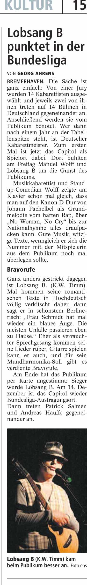 Lobsang Be punktet in der Bundesliga 09:17RedaktionAllgemein, Presse, Freunde0 Aus der NZ/ Georg Ahrens: Die Sache ist ganz einfach: Von einer Jury wurden 14 Kabarettisten ausgewählt und jeweils zwei von ihnen treten auf 14 Bühnen in Deutschland gegeneinander an …