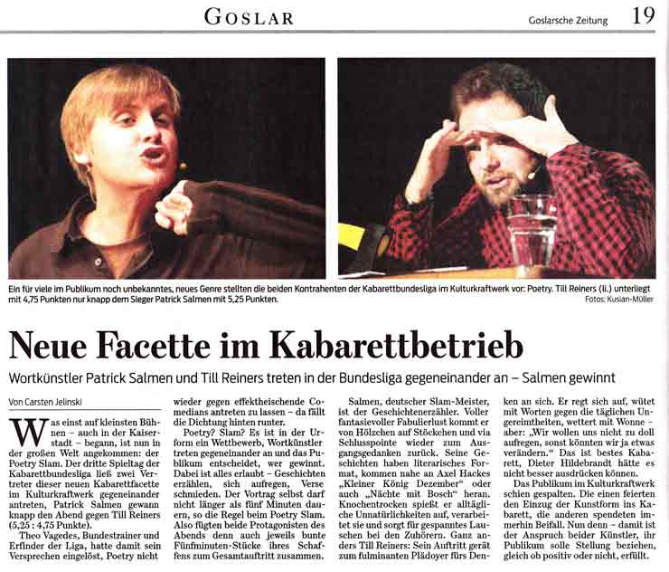 Neue Facette im Kabarettbetrieb 14:58RedaktionAllgemein, Presse, Freunde0 Wortkünstler Patrick Salmen und Till Reiners treten in der Bundesliga gegeneinander an – Salmen gewinnt. Aus der Goslarschen Zeitung von Carsten Jelinski.