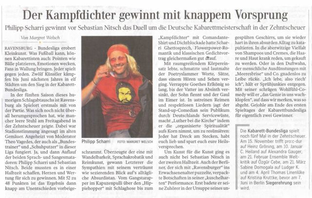 Spielergebnis zwischen Scharri und Nitsch … 10:23RedaktionAllgemein, Presse, Spielbericht0 Ein äußerst knappes Ergebnis im Spiel am 20.09. in der Zehntscheuer in Ravensburg. Mit 52 % der Stimmen konnte Philipp Scharri den Abend für sich entscheiden, 48 % der Zuschauer sahen Sebastian Nitsch vorne…
