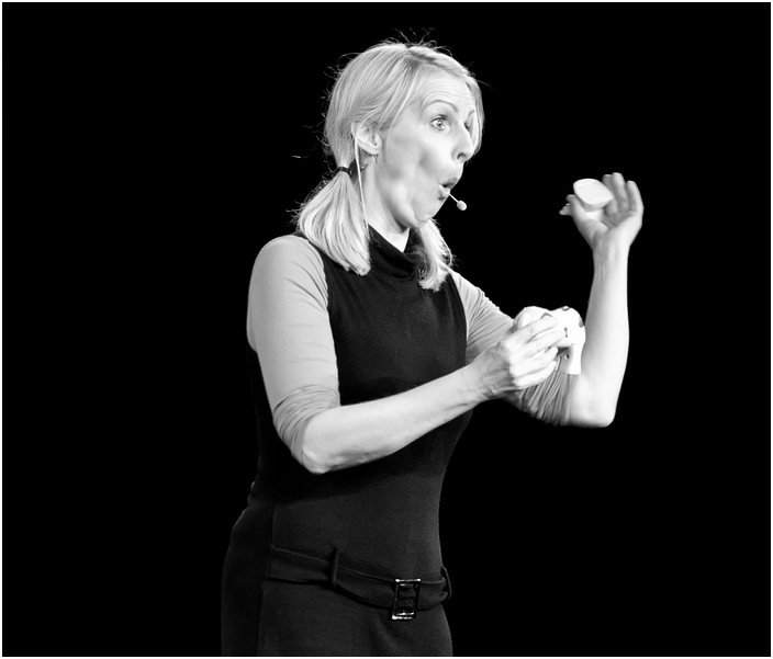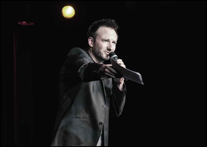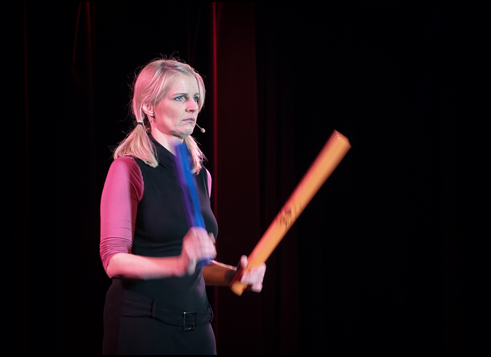 Doch die erste Halbzeit gehört Barbara Ruscher, singend, rappend und erzählend. Auch wenn sie immer wieder betont, dass sie der Realität ins Auge blicken will, sie sei eben nur die Vorgruppe, kann sie ihr Publikum mit Fischstäbchen begeistern, „Panierfehler! Ein Fischstäbchen packt aus“ ist Programm.