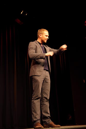 Kai Spitzl dagegen ging die Sache zwar auch musikalisch an, zog das Publikum dabei aber vielmehr durch seine ruhigen und tiefsinnigen Geschichten in den Bann, die er mit viel Wortwitz garnierte. Ein Paradebeispiel für diese Kunst bot er sicherlich mit der Liebesgeschichte zu einer Glühbirne – die allerdings kein Happy End hatte. Denn, so sang Spitzl, reagierte sie eines Tages nicht mehr, wenn er sie anmachte. „Bist einfach durchgebrannt“… Punkten konnte er bei den Zuschauern auch durch seine Geschichten von Sandalisten, den Nachfolgern der Salladisten – einer veganen Bewegung, oder seiner Erklärung des Worts „daxsen“ – einfach übersetzt mit „Suizid nach Kursabsturz“. Genauso leuchtete seine Begründung des Begriffs „Flachbildschirm“ für Fernseher schnell ein: Welches Wort würde besser passen, will man sagen, dass da einiges schief läuft im Programm?!