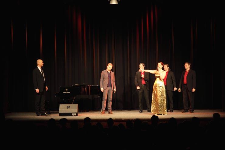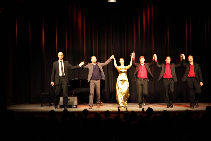 Vocall Recall setzte als A-capella-Gruppe (mit Kapelle) auf die komödiantische Neuinterpretation bekannter Hits. „Mit Kapelle“ steht dabei übrigens nicht für die Begleitung durch irgendein Schützenfest-Ensemble. Dafür reicht bei der Boygroup mit Frau – wie sie auch genannt werden – allein ein Mann am Klavier, der schwungvoll in die Tasten greift und das Ganze mit rhythmischen Elektro-Beats unterlegt. Besonders gut kam beim Publikum zum Beispiel ihr Medley von Stücken wie Sweet Home Alabama, Nur mal kurz die Welt retten, Twist and Shout und Junimond an. Auf der Grundlage dieser Songs sangen sie die Geschichte einer jungen Studentin, die endlich von Zuhause aus- und bei einem jungen Studenten einzieht. Allerdings hält diese WG nicht lang, und das Mädchen kehrt schon bald zurück zur Mutti. Eine besondere Überraschung gelang der Truppe gleich zu Beginn ihres Auftritts mit einem Remix des Titels „Uptown Girl“: Dabei ging es um eine junge Frau, deren Kühlschrank zugeeist war. Die Sanges-Botschaft dazu: „Abtauen, Girl“.