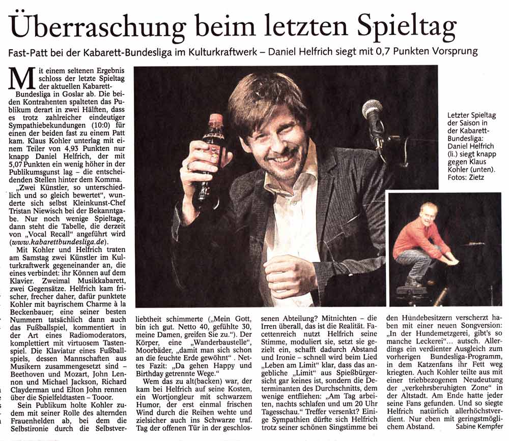 Mit einem seltenen Ergebnis schloss der letzte Spieltag der aktuellen Kabarettbundesliga in Goslar ab. Die beiden Kontrahenten spalteten das Publikum derart in zwei Hälften, dass es trotz zahlreicher eindeutiger Sympathiebekundungen (10:0) für einen der beiden fast zu einerm Patt kam. (Aus der Goslarschen Zeitung)
