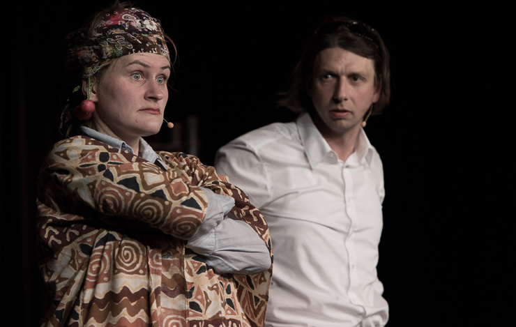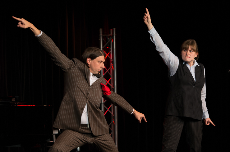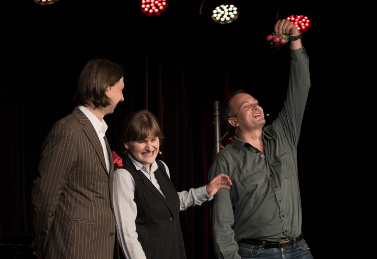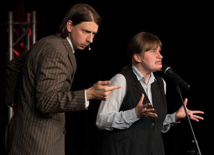 Auftritt Ensemble Weltkritik! Silke Sumpf-Pretzsch (früher nur Sumpf) und Thomas Lühmlich aus Leipzig (eigentlich Bettina Prokert und Maxim Hofmann) gestalten einen „Bunten Abend“. Ehrengast ist Herr Pöltnitz in der zweiten Reihe. Eigentlich haben wir ihm diesen „Bunten Abend“ zu verdanken, denn er ist der Betreuer der Agentur für Arbeit. Er sorgte dafür, dass die beiden trotz des wertlosen Studiums Geld verdienen, dass das Programm auch passt, dass da auch mal Stimmung aufkommt, dass die beiden professionelle Rampensäue sind. Dafür kümmern die beiden sich rührend um Herrn Pölnitz.