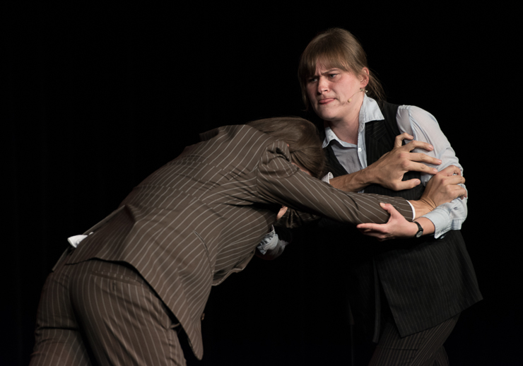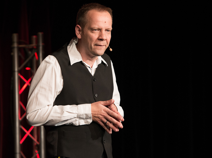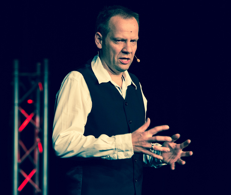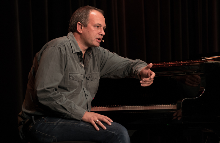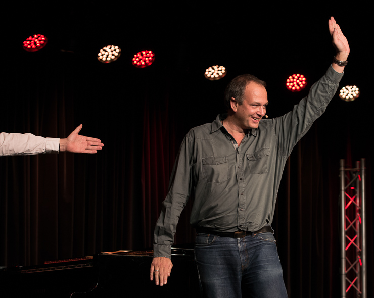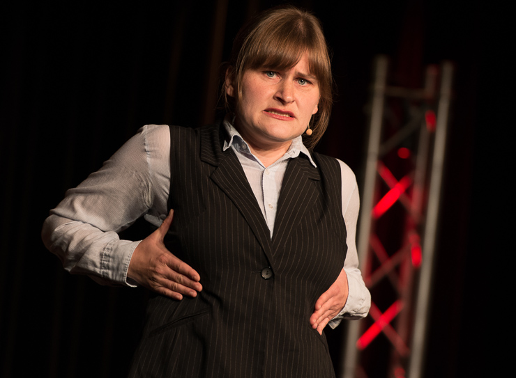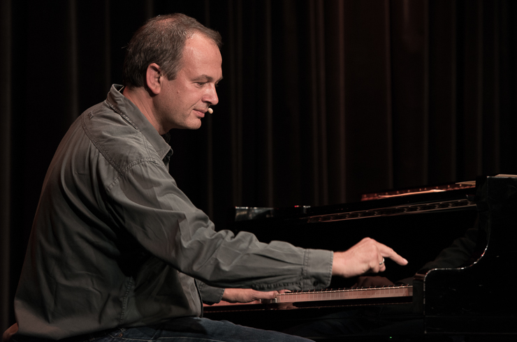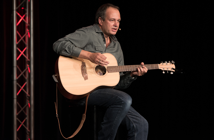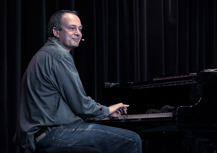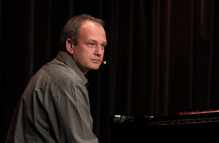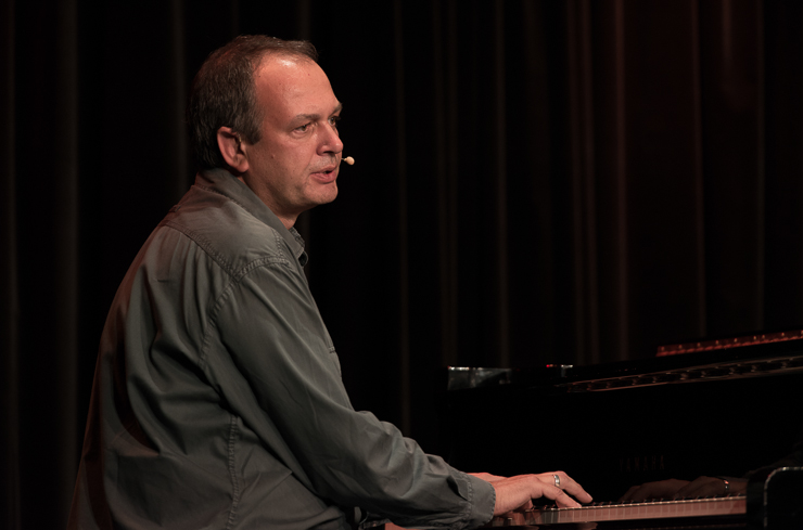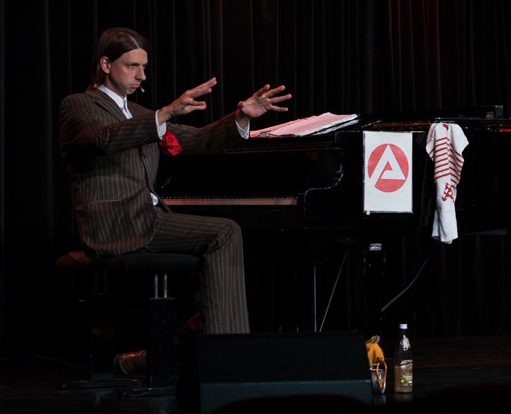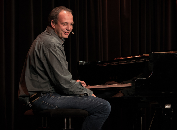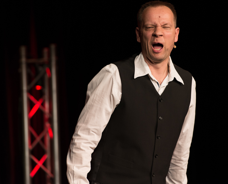Die zweite Halbzeit bestreitet Thomas Lienenlüke. Er schreibt sonst für andere wie Mathias Richling und trägt uns nun die Sachen vor, „die er nicht verkauft bekommen hat“. Er singt uns ein Lied von Malte, dem hochbegabten Sohn, der mit drei schon vier Fremdsprachen spricht, Klavier spielt, ein Mathe-Genie ist …, der ganze Stolz des Vaters. Nur irgendwas stimmt da nicht, außer den Eltern hält niemand Malte für hochbegabt. Ob Malte das überlebt? Ob man nicht doch besser ein neues Kind zeugen sollte? Aber Lienenlüke kann auch romantische Liebeslieder, insbesondere aus seiner ostwestfälischen Heimat, eine Gegend, bei deren Erschaffung Gott gemeint hat, dass es dafür auch Laminat tue. Die Liebeslieder erzählen vom Gruppensex in Ostwestfalen, da sind zwei schon richtig viel. Oder sie handeln von elitepartner.de, wie sich zwei finden, die so gut zusammenpassen, die so gebildet und kultiviert sind. Doch darunter verstecken sich Abgründe und nicht alle überleben ihre Liebesabenteuer.