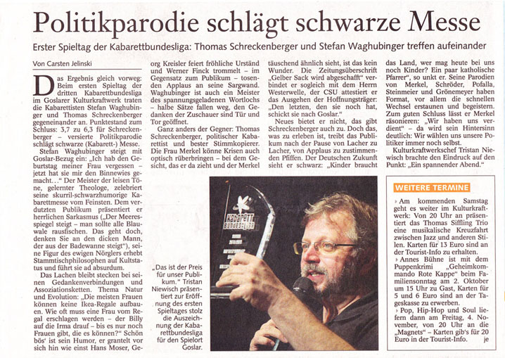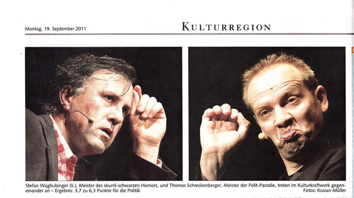 Das Ergebnis gleich vorweg: Beim ersten Spieltag der dritten Kabarettbundesliga im Goslarer Kulturkraftwerk traten die Kabarettisten Stefan Waghubinger und Thomas Schreckenberger gegeneinander an. Punktestand zum Schluss: 3,7 zu 6,3 für Schreckenberger…
